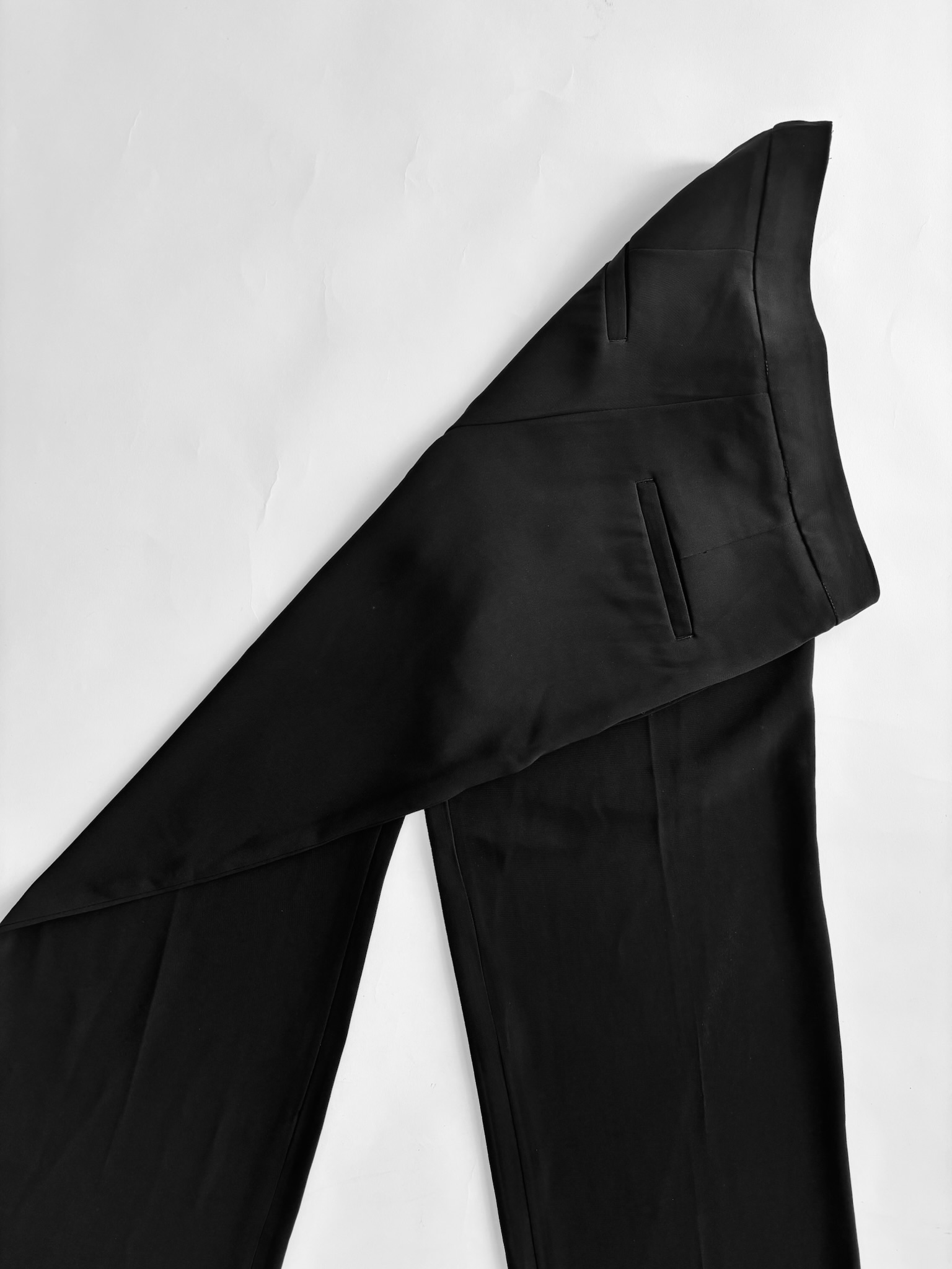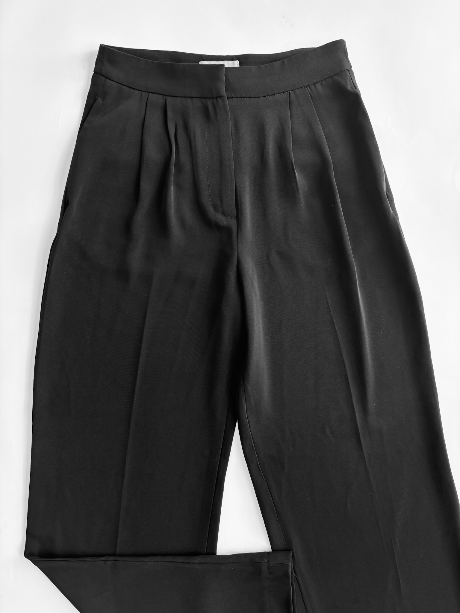 Tiro alto, corte pierna ancha, tela fluida. No estos